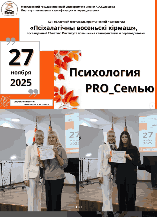 27.11.2025 педагоги-психологи МОСПЦ приняли активное участие в XVII областном фестивале практической психологии «Псіхалагічны восеньскі кірмаш». Посетили мастер-классы, проведенные практическими психологами г. Могилева и г. Минска, по работе с семьями. Полученные знания в рамках фестиваля педагогами-психологами будут применены в практической работе по гармонизации внутрисемейных взаимоотношений.